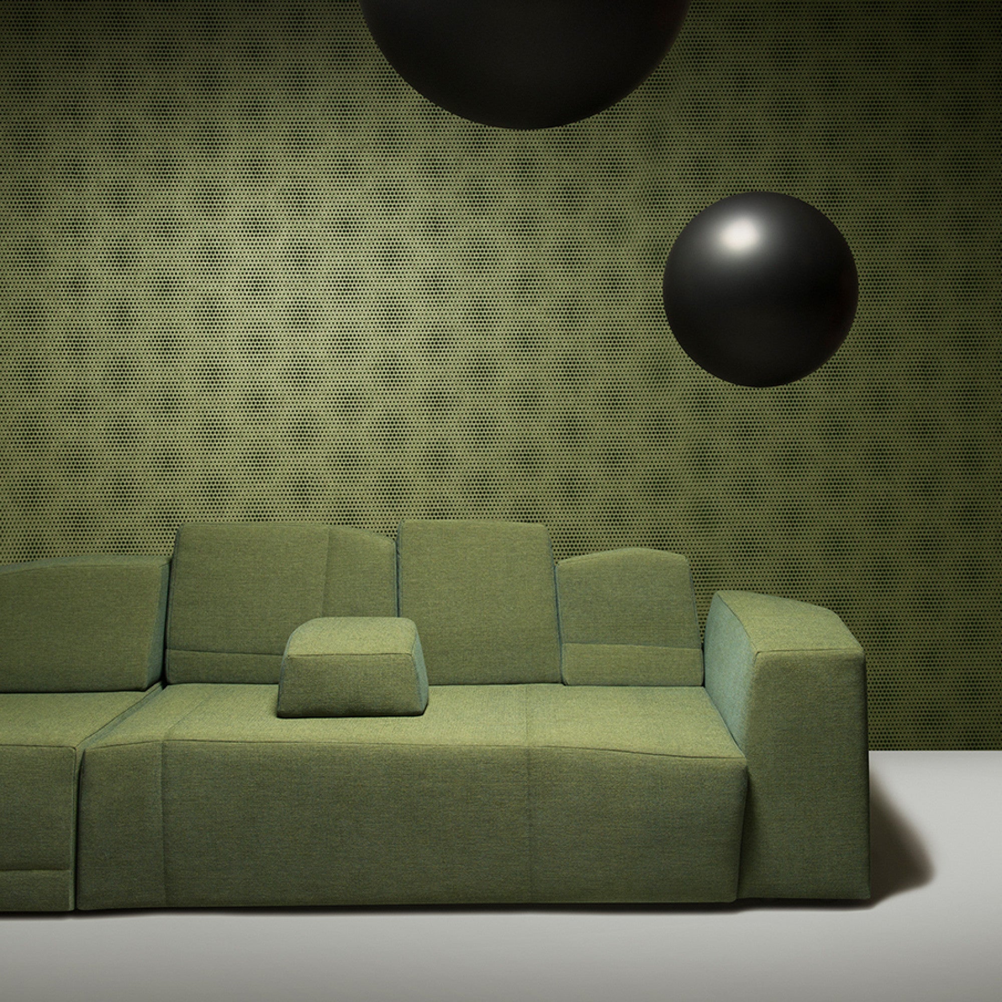 Printed wallcovering with a flock finish inspired by the mysterious Blooming Seadragons, who evolved spectacular leaf-like appendages in yellow, brown and green as a clever camouflage.
