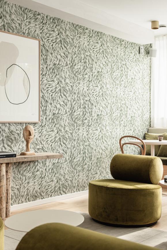Printed wallcovering with a flock finish, resembling the beautiful fur of the Blushing Sloth, which lived its life so still and quiet that algae found a way of growing on the outer layers of their fur, giving them a breath-taking glow.