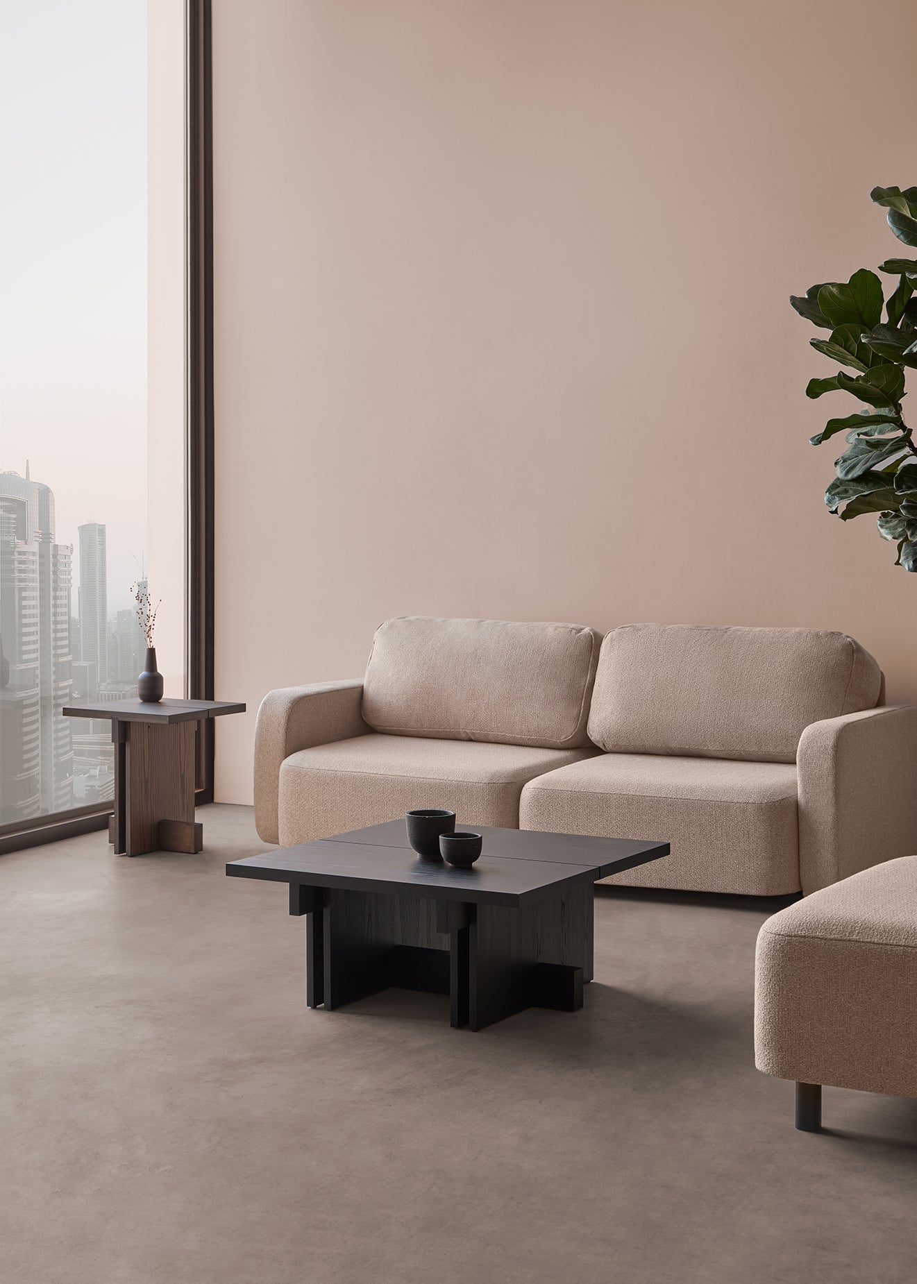 Where contemporary design meets timeless craftsmanship. The Rak tables, designed in ash wood, play with architectural volumes and geometric precision. Their overlapping planes and clean lines create a striking yet warm presence, adding character to any living space.