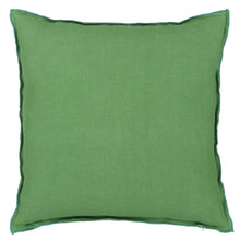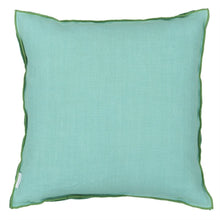Two tones of Brera Lino pure tumbled linen feature in this contemporary square cushion in emerald reversing to marine. Finished with a tonal overlocked stitch border this modern linen cushion is the perfect complement for any scheme.