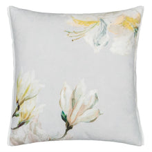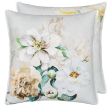 Classical renderings of camellias and roses in glorious detail adorn this large square floral cushion. Digitally printed onto a pure tumbled linen ground and finished with an elegant white linen trim on two sides.