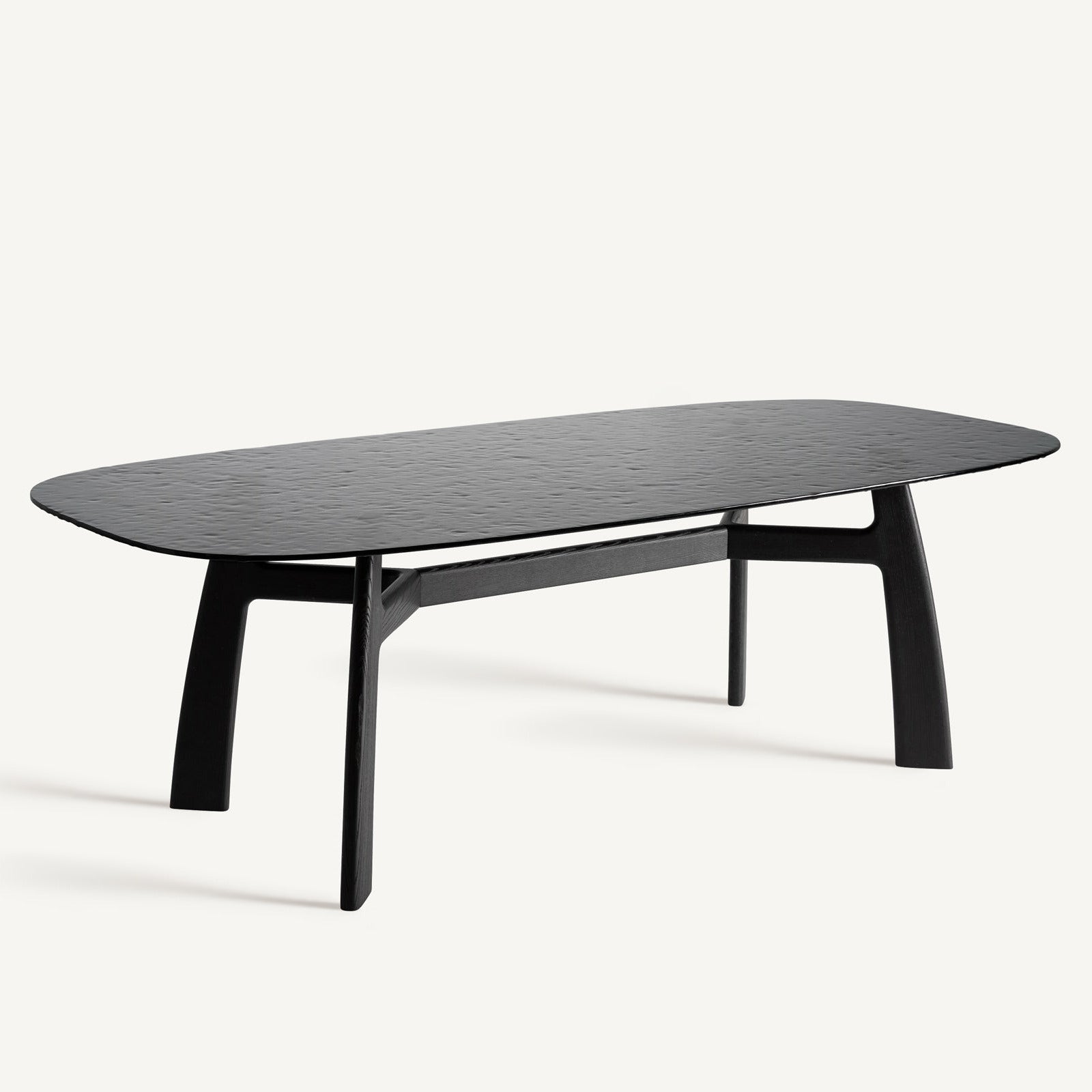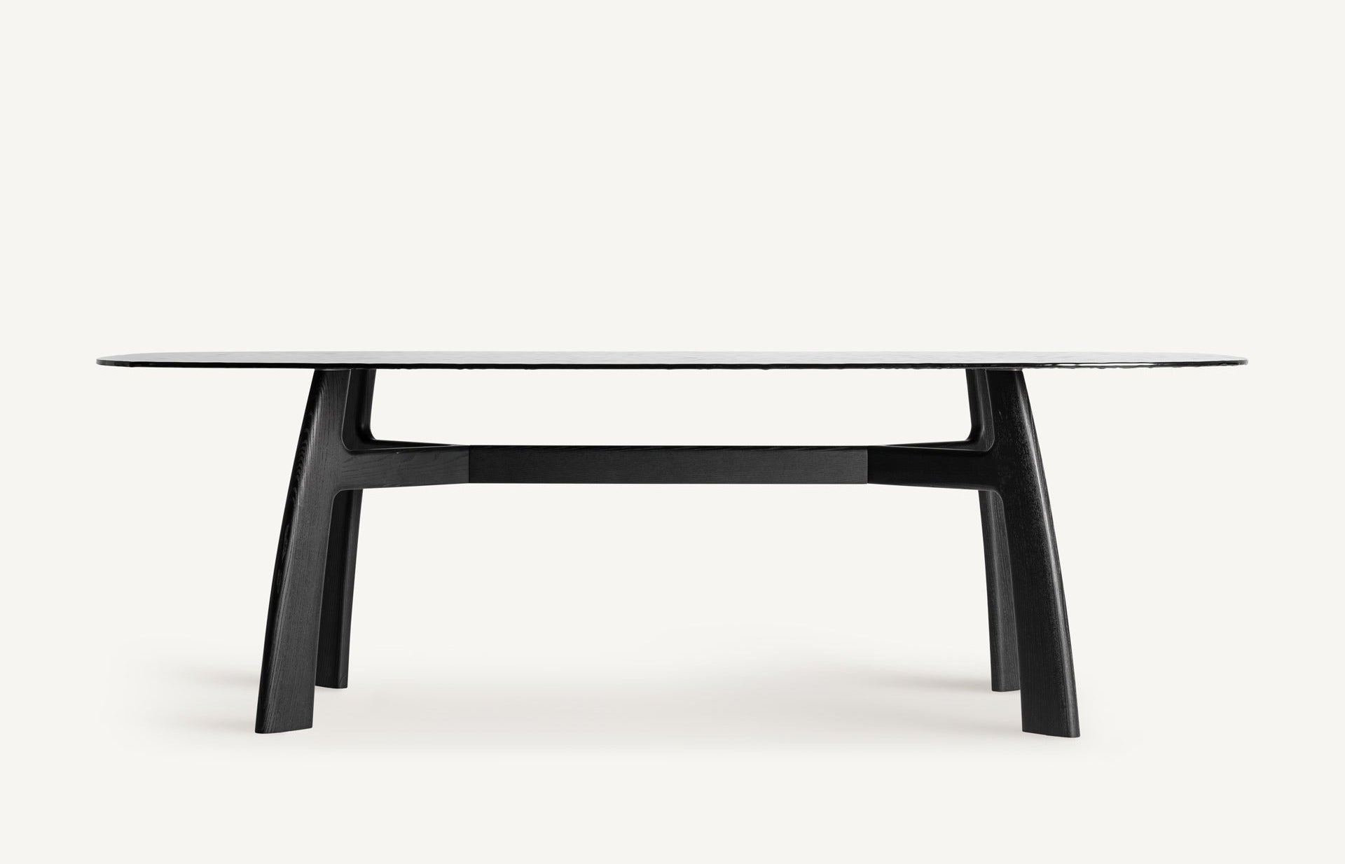 A refined balance of modern design and noble materials, the Suchdol dining table brings a sophisticated, architectural presence to any contemporary interior. Its sculptural ash-wood structure, finished in deep black, contrasts elegantly with the tempered black glass top, creating a piece that is both sleek and striking.