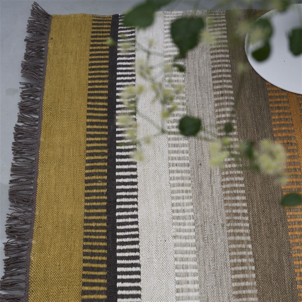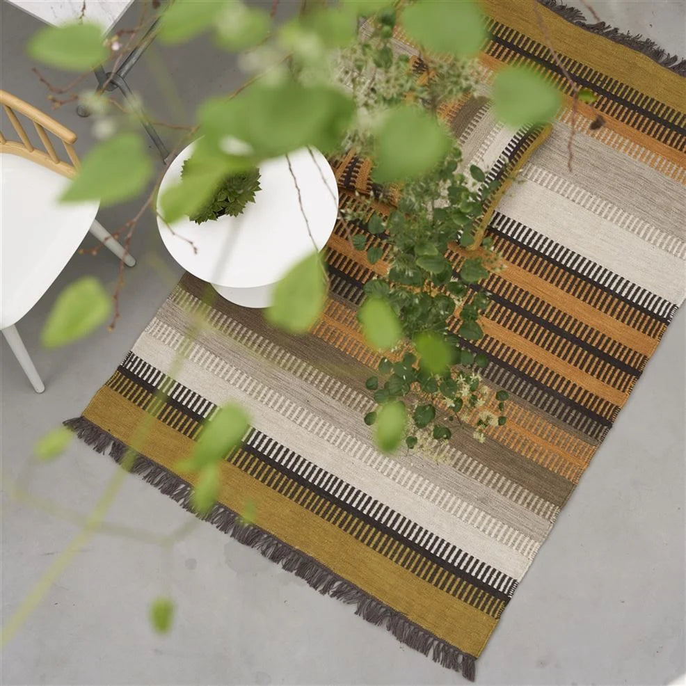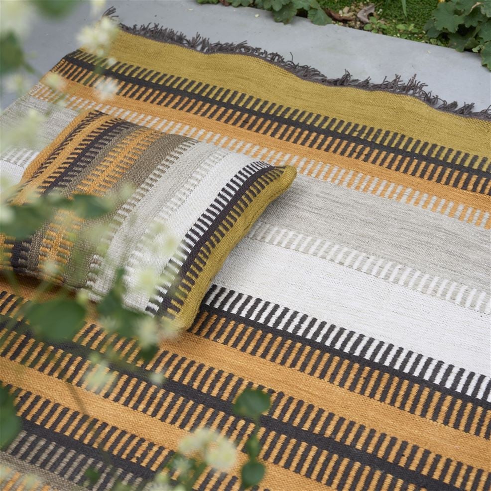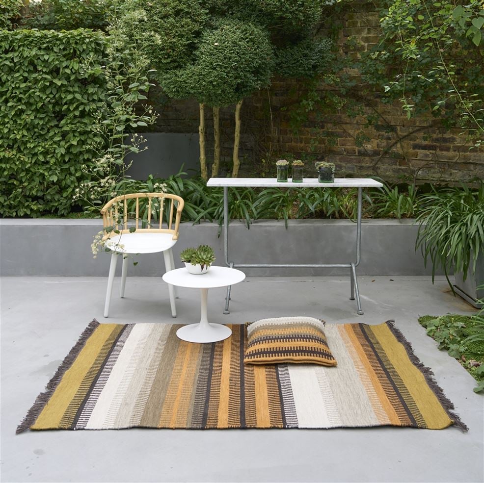 The perfect rug for inside and out - a dynamic striped outdoor rug inspired by vintage hand woven rugs. In gorgeous neutral earthy tones of whites and greys mixed with ochre and sienna this durable and easy to clean handloom woven flat weave rug is constructed from a specialist polyester yarn made from recycled plastic bottles. In a small medium and runner size. As with all our outdoor furnishings please note that these rugs should not be left outside in harsh weather conditions or in direct sunlight for extended periods of time and care should be taken to dry out the rug should it get soaking wet and water logged. Please ensure that both the rug and the area where it will be placed are dry before use.