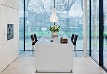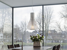Materials: Suspension lamp providing diffused lighting. Chemically photo-etched stainless steel body and borosilicate diffuser. Liquid paint protection. Die-cast aluminum base, 30% fiberglass-reinforced polyamide ceiling rose attached to a pressed and galvanized steel ceiling fixture. In this version the light emission can be adjusted by means of a mechanical movement that opens the louvers, thereby varying the shape of the luminaire. Steel suspension cable, FEP/PVC power cord of the same color as the luminaire.