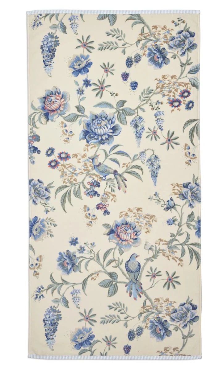 The luxurious bath linen collection Secret Garden gives your bathroom a surprising colour accent. The towels feature large colourful peonies interspersed with imaginative flowers, leaves and blackberries and currant bunches. Nestled among the flowers are birds of paradise. The towel is finished with a contrasting coloured stripe and has a handy hanging loop.