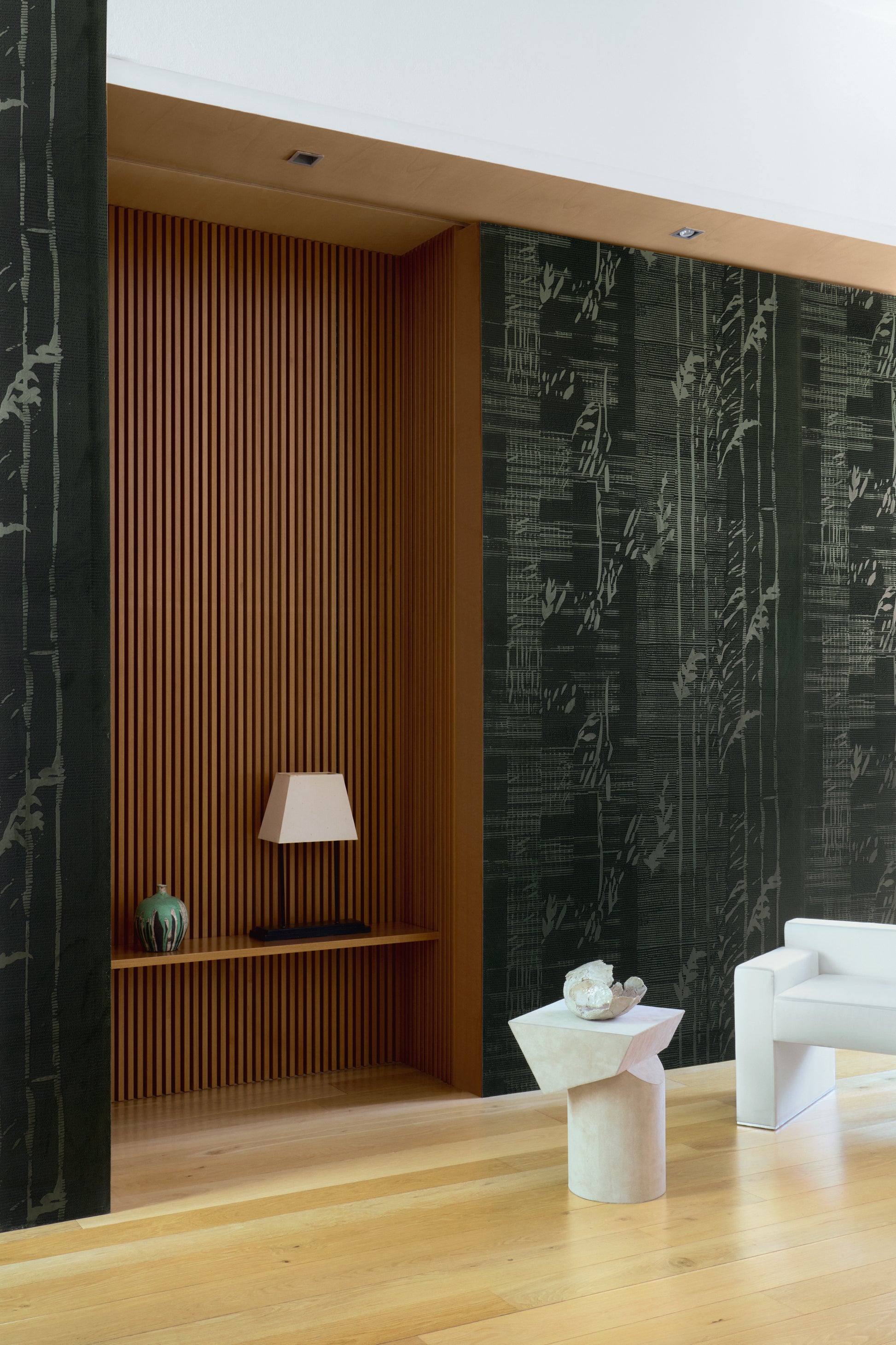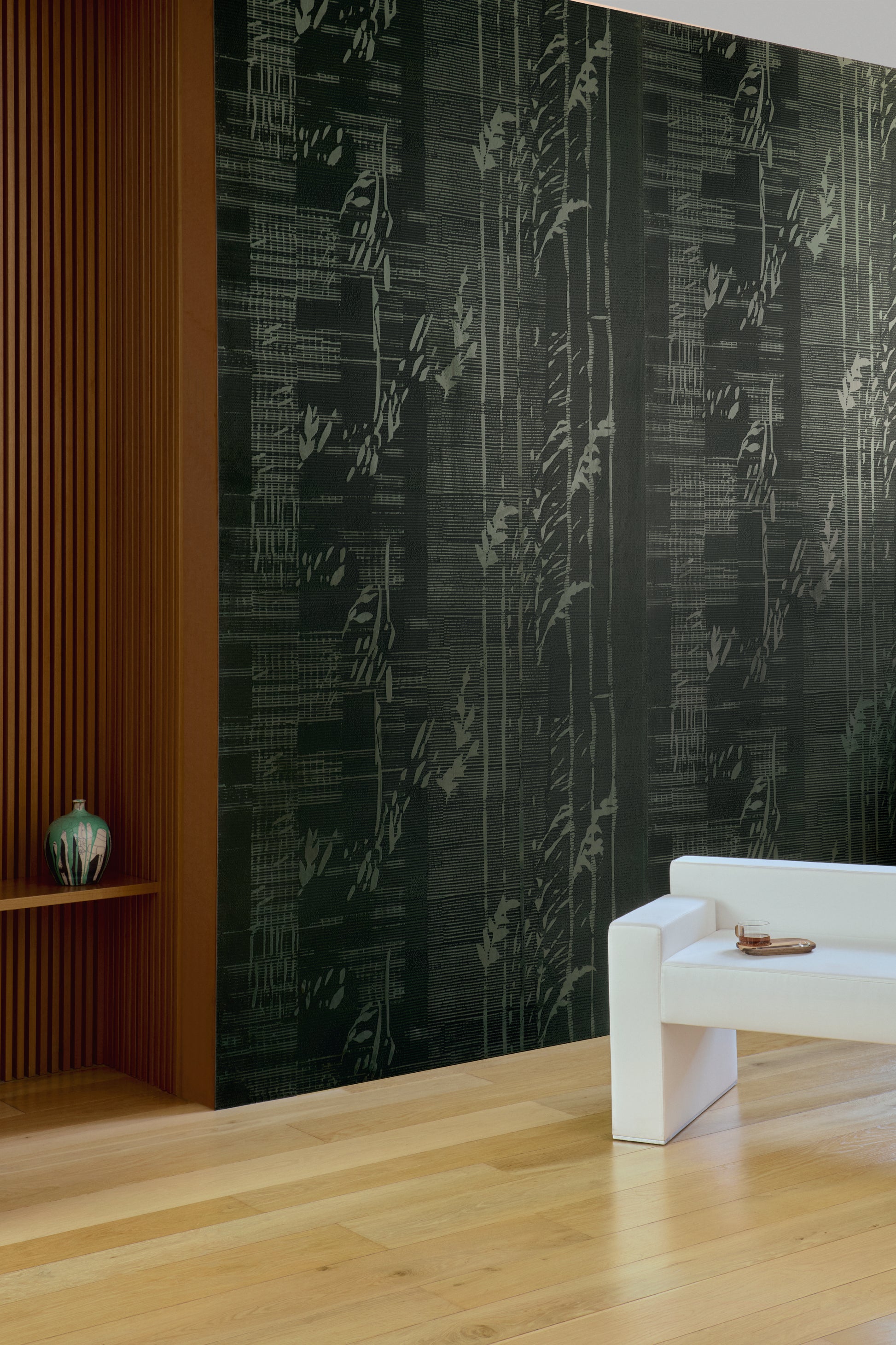 Elitis’ Shinrin Wallpaper, from the Velatura collection, is a quiet ode to nature’s serenity. Like sunlight drifting through a canopy of leaves, its delicate pattern dances across the wall, whispering of forests and stillness. The design invites calm and reflection, turning any room into a tranquil retreat where light and texture move in harmony.