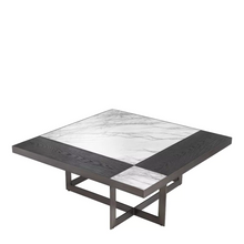 The chic Hermoza Coffee Table successfully couples the richness of Italian bianco lilac marble and the retro look and feel of mocha oak veneer. This stunning coffee table has a sleek metal frame with pewter finish and is equally at home in Mid-Century Modern interiors as in traditional décors.