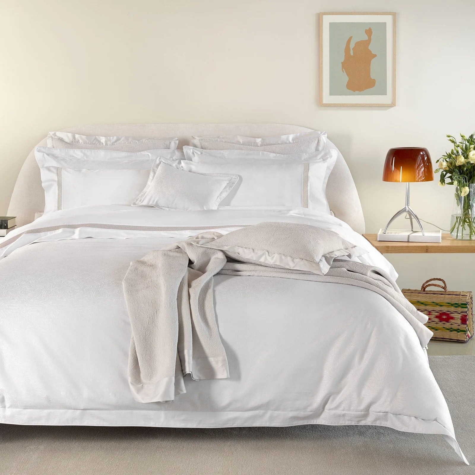 Materials: Woven from 300TC cotton jacquard. Duvet cover with flange and piping on three sides. Sham (Oxford pillowcase) and boudoir with piping on four sides.