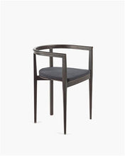 The graceful Elé chair epitomises the tensions at play within many of the collection’s pieces, with a design that experiments with both form and dimension. It touches the ground lightly, belying the strength of the wooden frame, while the front legs feature an unexpected twist, subtly transitioning from square to round at the seat. The almost flat front and curved back and arm structure create a solid D-shape when viewed from above, which seems almost at odds with the slender lines of the chair’s profile. This results in a chair that is refined, elegant and graphic at the same time.