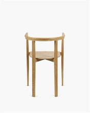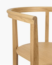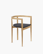 The graceful Elé chair epitomises the tensions at play within many of the collection’s pieces, with a design that experiments with both form and dimension. It touches the ground lightly, belying the strength of the wooden frame, while the front legs feature an unexpected twist, subtly transitioning from square to round at the seat. The almost flat front and curved back and arm structure create a solid D-shape when viewed from above, which seems almost at odds with the slender lines of the chair’s profile. This results in a chair that is refined, elegant and graphic at the same time.