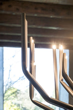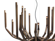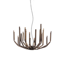 Materials: Suspension lamp composed by iron pipes crushed with mechanical bending, burnished finish. Each pipe carries a G9 bulb | 60W max. Steel tube and steel cable lenght 2.5 mt. Ceiling rose same finish as the lamp.