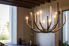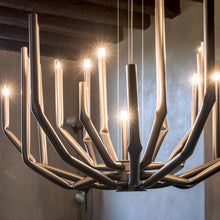 To_Be is a suspension lamp made of mechanically bent iron tubes with 6, 12 or 18 arms with G9 bulbs lamp holder, with a burnished and matt white painted finish. It is a chandelier with a strong industrial inspiration, both in materials and in the process: it is obtained from a tube crushed and deformed by mechanical bending, laser cutting and welding. Minimal but of great impact.