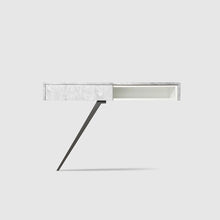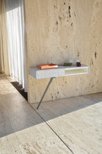 ATIR is a piece of exquisite elegance and lightness, with an intriguing sense of disequilibrium and instability, given by the presence of only one leg. A slim height drawer and shelf, as well as the top, offer comfortable storage space to this partially wall mount piece of iconic furniture.