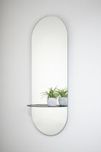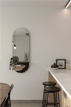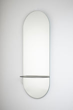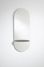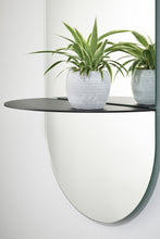 The LOOP design mirror owes its name to the soft semicircular shape of the mirror, a shape which is echoed in the black powder-coated metal shelf. The minimalist table is perfect for your keys, glasses, ... A very simple concept, but once on the wall a real star in your entrance hall, living room or bedroom.