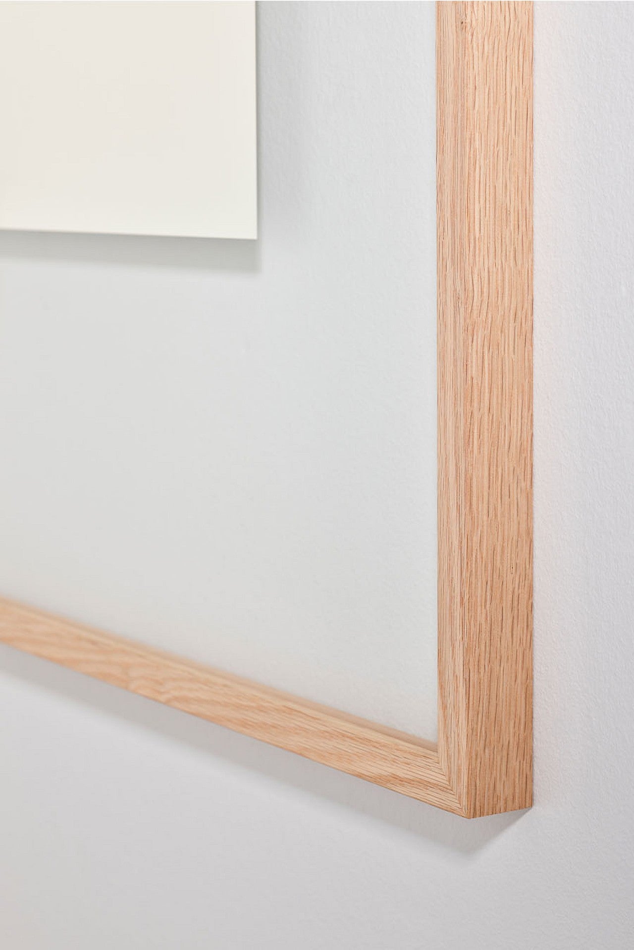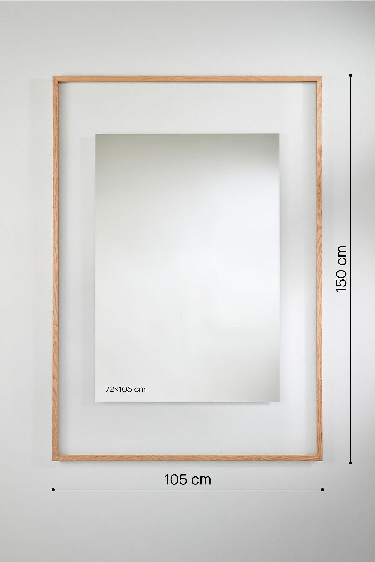 The symmetrical oak frame echoes the balance and proportion of traditional picture frames. The silvered surface is precisely placed, allowing light to pass through the clear glass and giving the impression that the mirror is gently floating. The transparent separation between the mirror and the frame becomes a neutral zone around the mirror. The viewer gets less distracted and his attention is focused entirely on the mirror and its reflection.