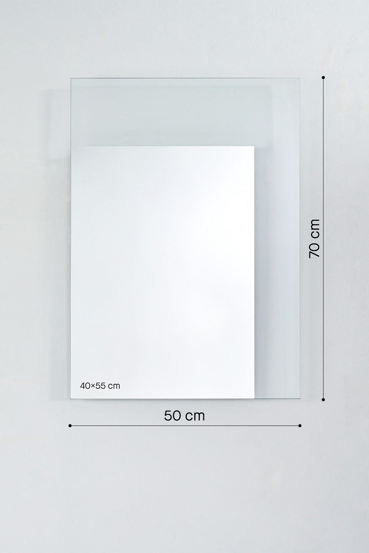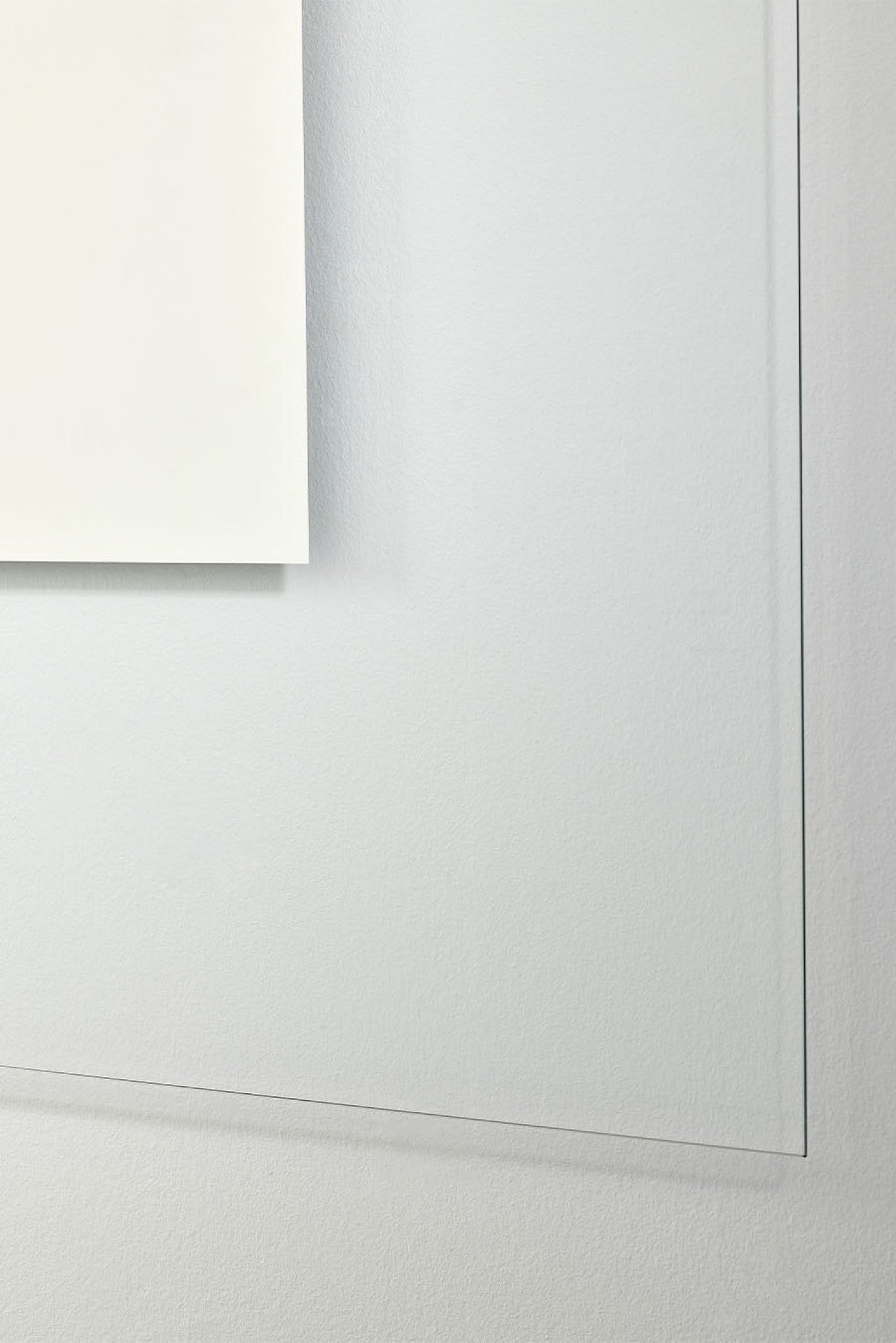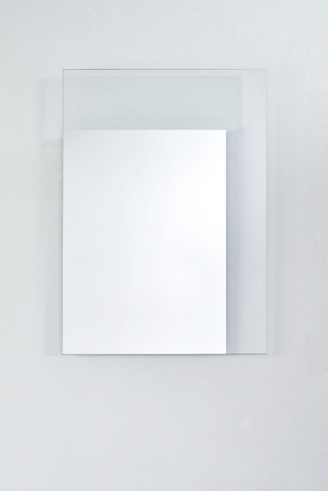 The asymmetrical composition of the mirror is all about reflection and transparency. The silvered mirrored part is abruptly cut off on two sides. The transparent glass blends seamlessly into the wall on the other 2 sides. The mirror subtly flows into the background through the transparent glass. Mirror and wall are brought together. As daylight moves across the room, it filters through the transparent areas or reflects off the silvered ones, casting soft, architectural shadows behind the surface. The result is an image that appears to float, an understated composition of light, line and reflection.