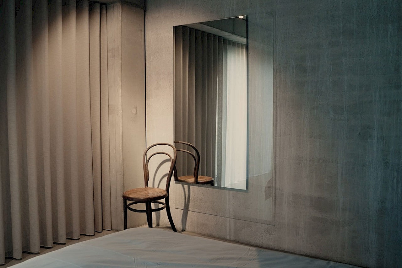 The asymmetrical composition of the mirror is all about reflection and transparency. The silvered mirrored part is abruptly cut off on two sides. The transparent glass blends seamlessly into the wall on the other 2 sides. The mirror subtly flows into the background through the transparent glass. Mirror and wall are brought together. As daylight moves across the room, it filters through the transparent areas or reflects off the silvered ones, casting soft, architectural shadows behind the surface. The result is an image that appears to float, an understated composition of light, line and reflection.