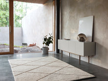 The technique of the C Carpet is extra time consuming and requires exceptionally skilled craftsmen. The base of this carpet is a hand woven Dhurrie in 100% wool (New Zealand and fine Indian wool mix) where a pattern/pile is knotted onto the base by hand. The wool used in this carpet is a natural wool and gives the weave a melange look. The pattern in the C Carpet is very subtle, yet interesting. It is actually the Dhurrie weave (base) that forms the pattern, which makes this carpet unique.