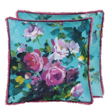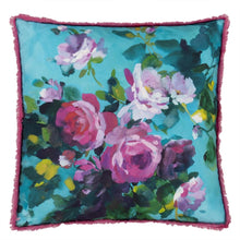This glorious cushion depicts a lively painterly impression of bouquets of summer roses in shades of magenta and violet on a vibrant turquoise ground. This fully reversible cushion is digitally printed onto textured cotton and embellished on all sides with a statement fringed trimming in bright fuchsia pink.