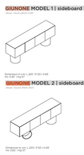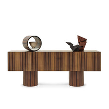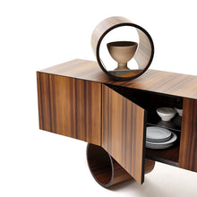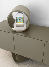 Giunone is a sideboard with MDF structure lacquered in all colors as per sample card or plated in heat-treated larch wood. Container with strong and austere lines, of great rigor. Cylindrical volumes distinguish the base interpreting each container with personality. The open decorative element is an accessory to be placed on the top.