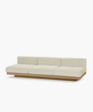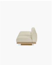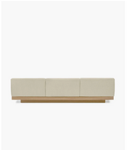 The three-seater from the Rudolph outdoor couch collection by Vincent Van Duysen combines texture, warmth, and tactility. With an aluminum frame covered in solid oak and custom-made Belgian fabrics available in neutral colors, this three-seater offers both comfort and simplicity. Pair it with the one- and two-seaters, as well as the ottoman, for an organic and super comfortable luxury outdoor sofa setup. Protective covers for the outdoor furniture are also available and highly recommended for rainy days.