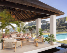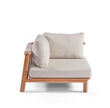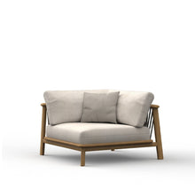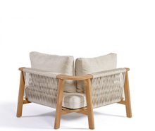 Outdoor modular sofa component featuring a solid teak wood frame and hand-braided rope detailing. Includes water-repellent, UV-resistant upholstery suitable for year-round outdoor use.