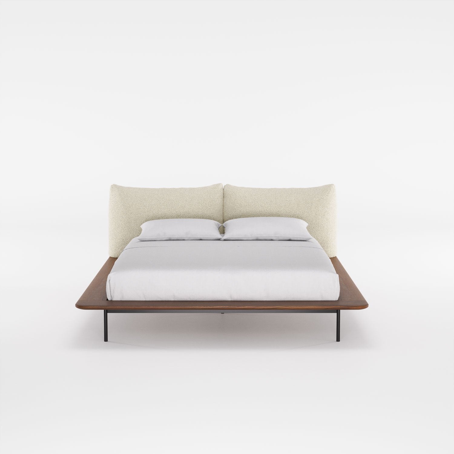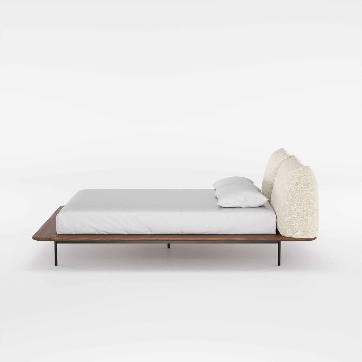 The bed's irresistible charm is a result of its craftsmanship, seamlessly marrying a substantial solid wood frame with a slender profile, supported by discreet metallic legs. Luxuriously upholstered back cushions not only offer a plush embrace but also double as a backrest and headboard, elevating both comfort and aesthetics.