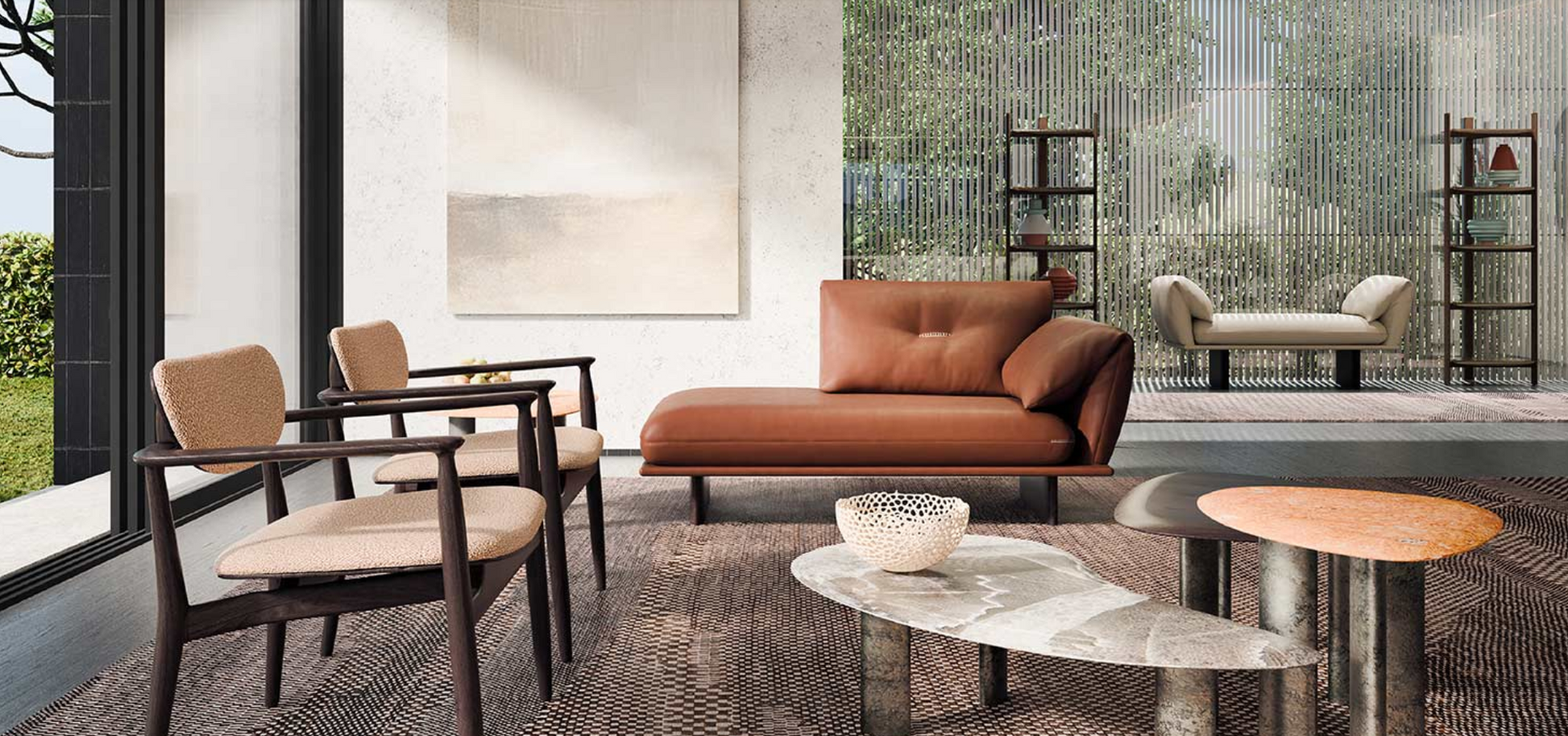 Its character lies in the contrast between structure and softness. Raised from the floor on two solid wood sled bases, the leather-covered platform gives the piece a strong architectural identity, while the generously padded top appears almost to float above it. The result is visually striking yet deeply inviting, a piece that feels sculptural, warm and effortlessly refined.