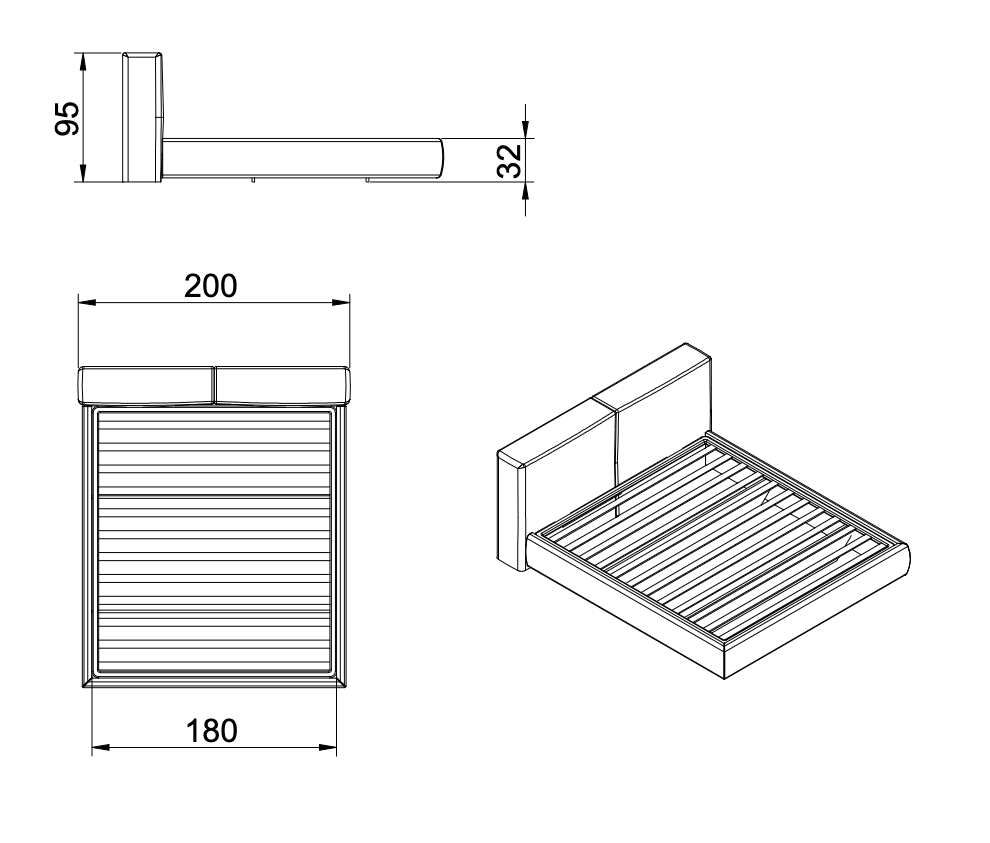 cm 200 headboard x 232 x H.95 (mattress 180x200 cm)